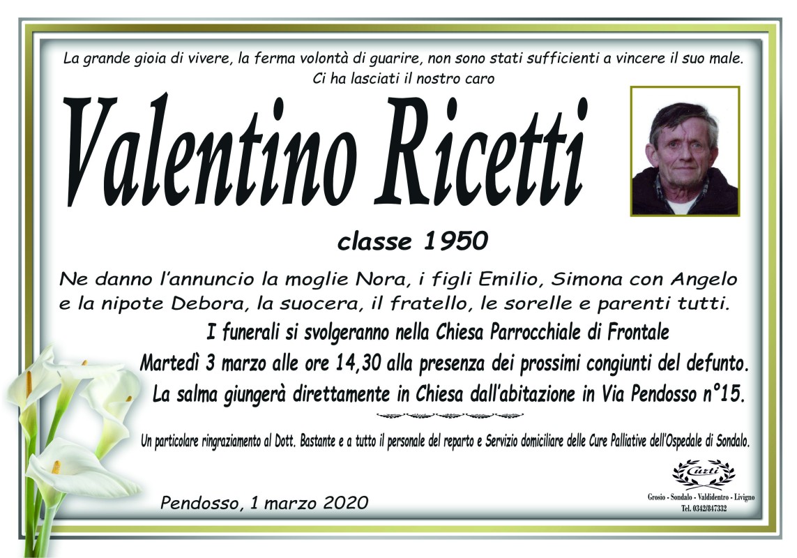 Lascia un messaggio di cordoglio, lo recapiteremo ai familiari di Lutto Ricetti Valentino