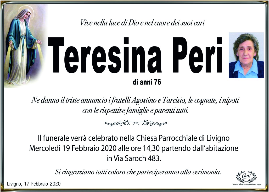 Lascia un messaggio di cordoglio, lo recapiteremo ai familiari di Peri Teresina
