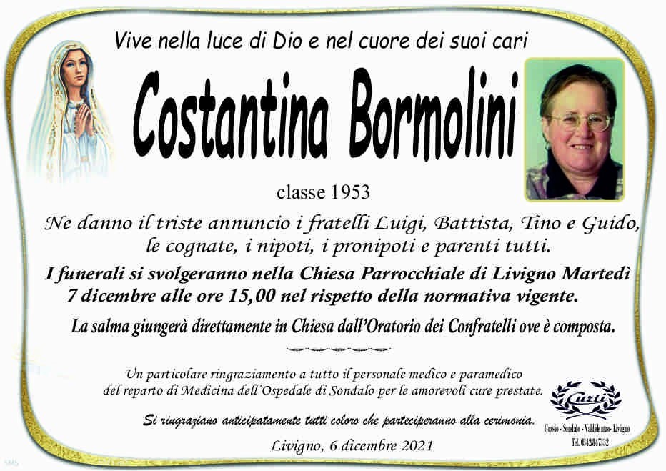 Lascia un messaggio di cordoglio, lo recapiteremo ai familiari di Bormolini Costantina