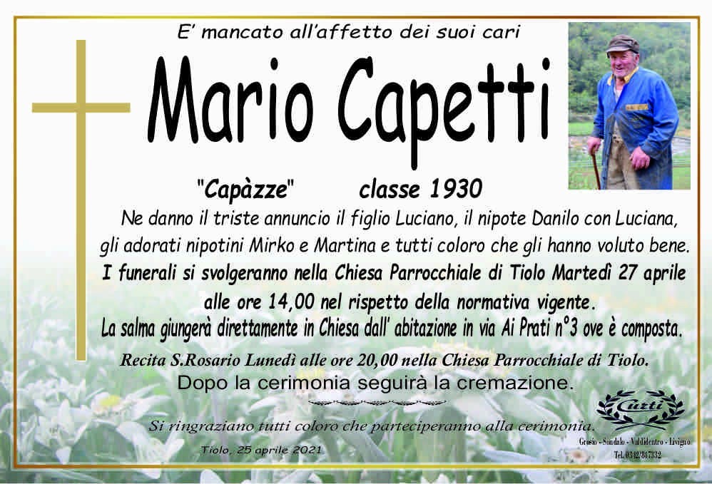 Lascia un messaggio di cordoglio, lo recapiteremo ai familiari di Capetti Mario