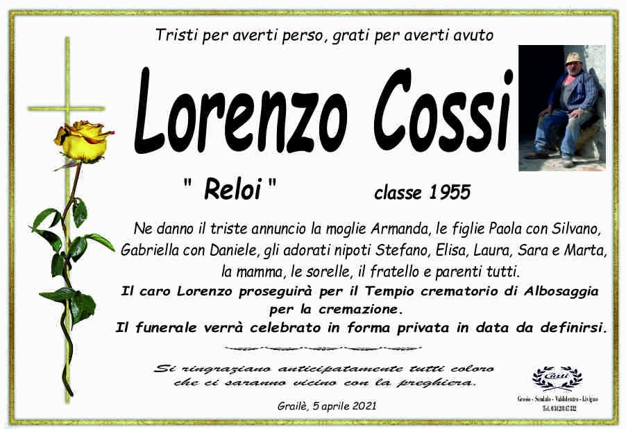 Lascia un messaggio di cordoglio, lo recapiteremo ai familiari di Cossi Lorenzo