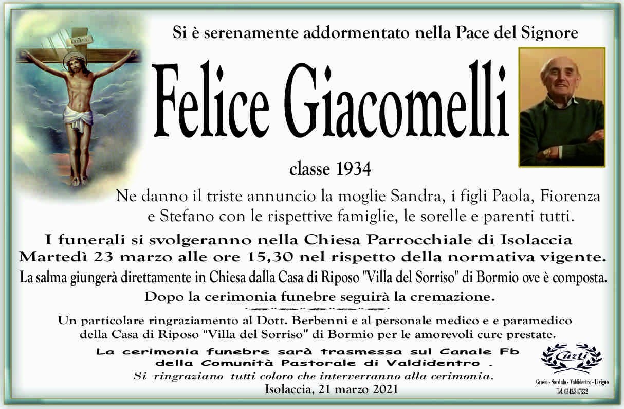 Lascia un messaggio di cordoglio, lo recapiteremo ai familiari di Giacomelli Felice