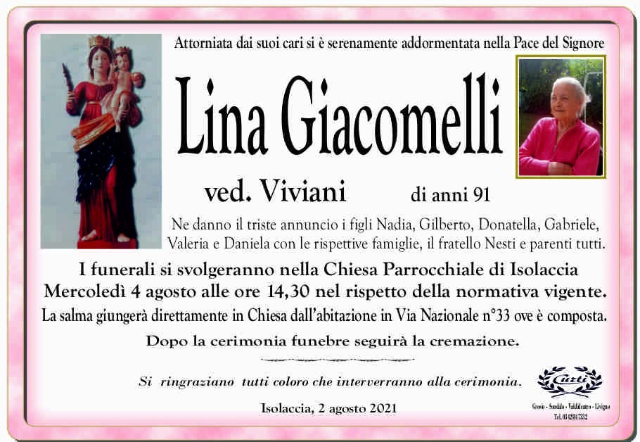 Lascia un messaggio di cordoglio, lo recapiteremo ai familiari di Giacomelli Lina