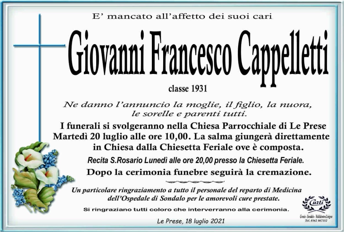 Lascia un messaggio di cordoglio, lo recapiteremo ai familiari di Lutto Cappelleti Giovanni Francesco