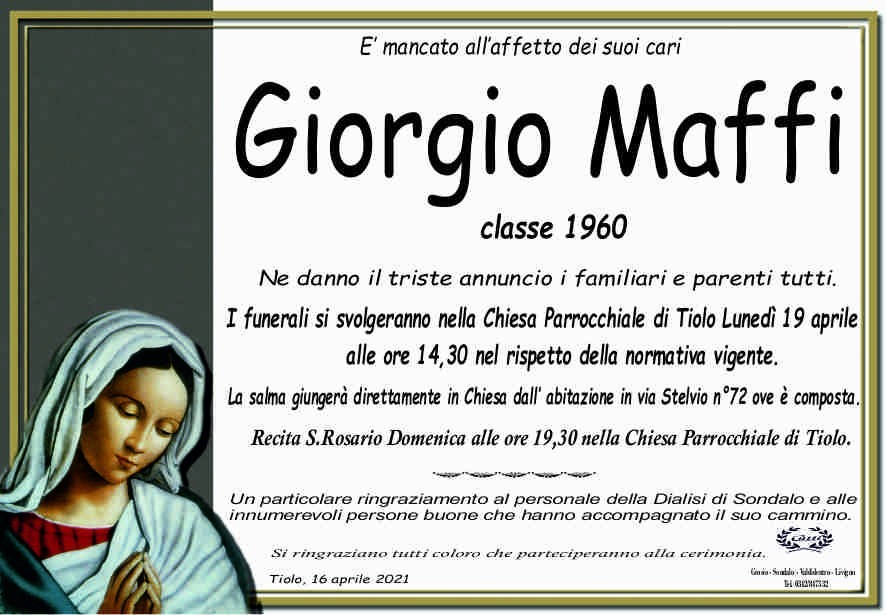 Lascia un messaggio di cordoglio, lo recapiteremo ai familiari di Maffi Giorgio