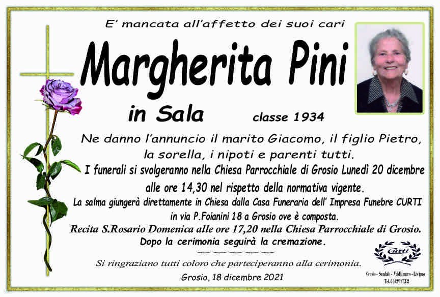 Lascia un messaggio di cordoglio, lo recapiteremo ai familiari di Pini Margherita