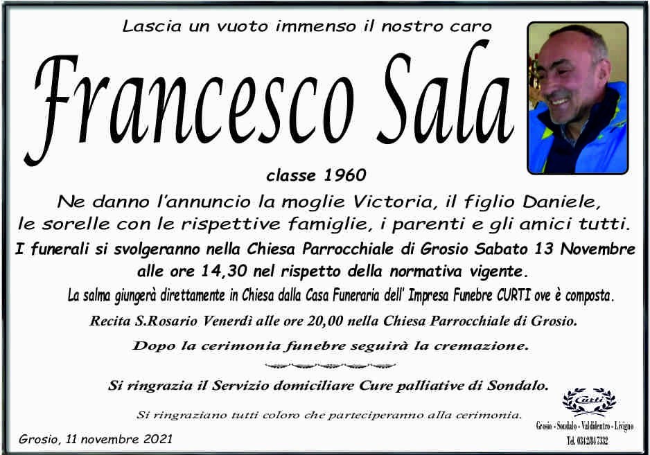 Lascia un messaggio di cordoglio, lo recapiteremo ai familiari di Sala Francesco