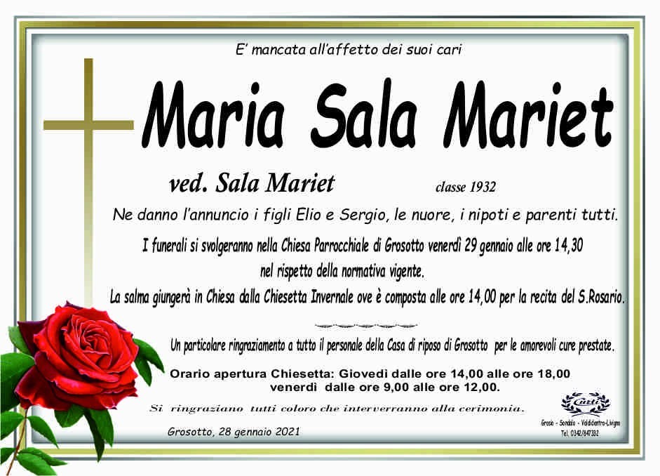 Lascia un messaggio di cordoglio, lo recapiteremo ai familiari di Sala Mariet Maria