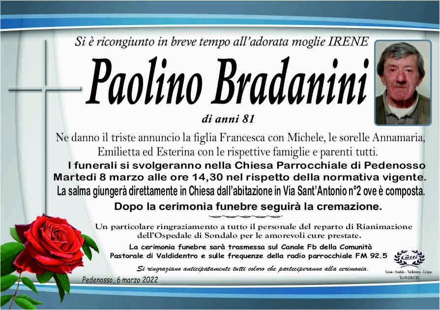 Lascia un messaggio di cordoglio, lo recapiteremo ai familiari di Bradanini Paolino