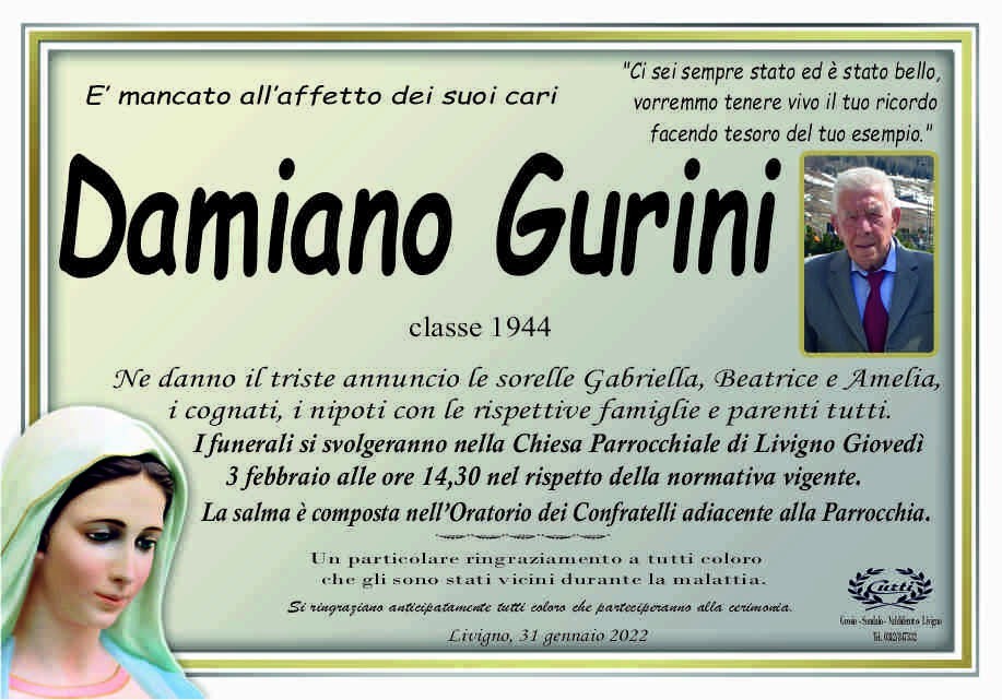 Lascia un messaggio di cordoglio, lo recapiteremo ai familiari di Lutto Gurini Damiano