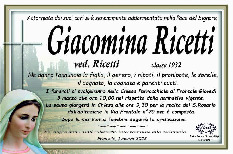 Lascia un messaggio di cordoglio, lo recapiteremo ai familiari di Lutto Ricetti Giacomina