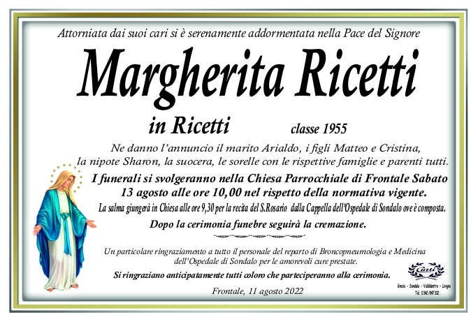 Lascia un messaggio di cordoglio, lo recapiteremo ai familiari di Lutto Ricetti Margherita
