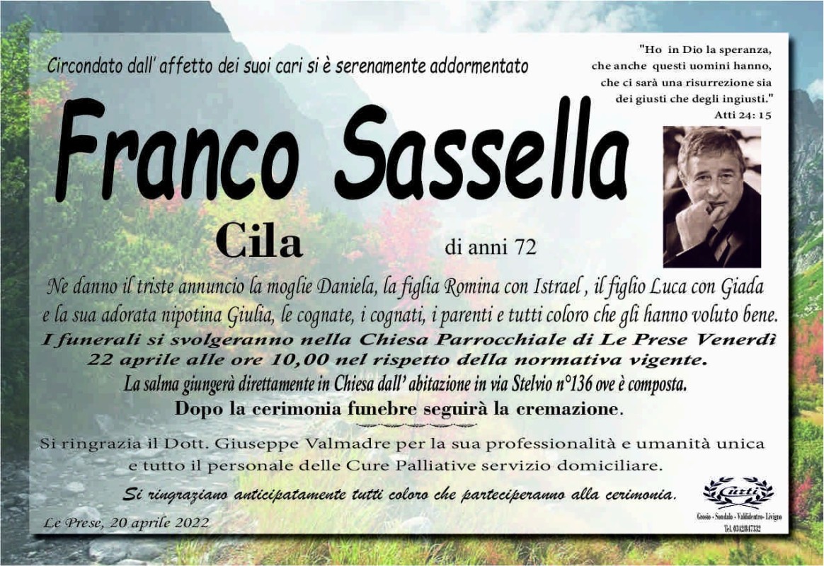 Lascia un messaggio di cordoglio, lo recapiteremo ai familiari di Sassella Franco