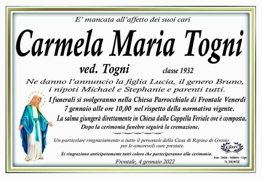 Lascia un messaggio di cordoglio, lo recapiteremo ai familiari di Togni Carmela Maria