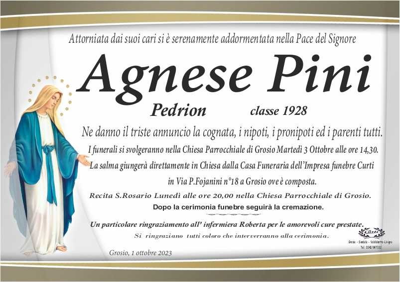 Lascia un messaggio di cordoglio, lo recapiteremo ai familiari di Pini Agnese
