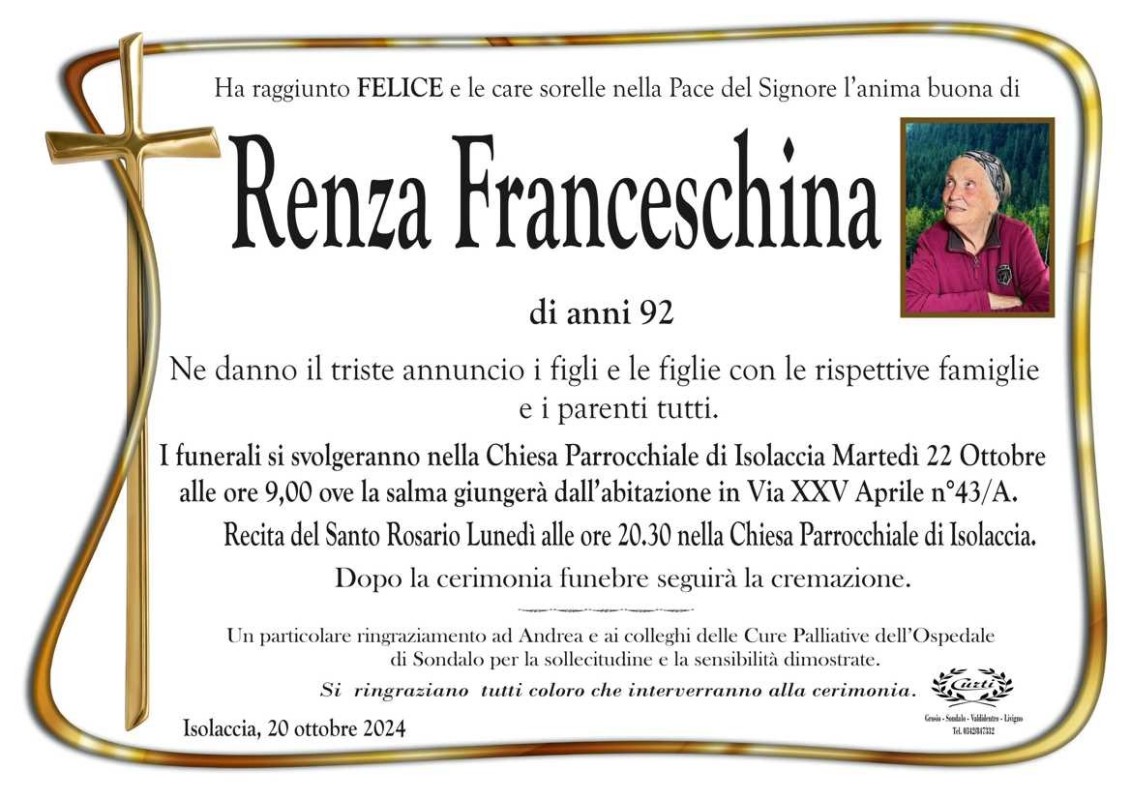 Lascia un messaggio di cordoglio, lo recapiteremo ai familiari di Francerschina Renza
