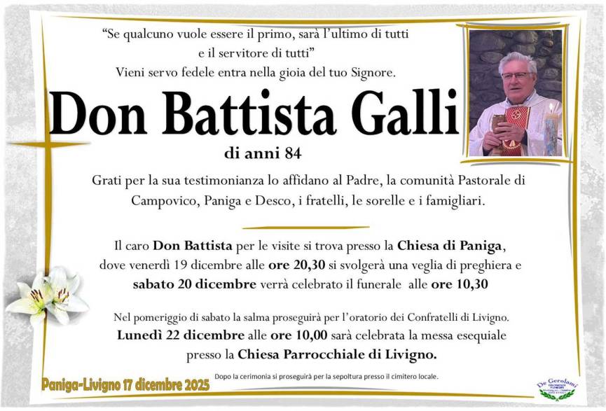Lascia un messaggio di cordoglio, lo recapiteremo ai familiari di don battista galli