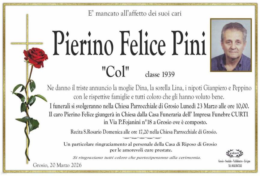 Lascia un messaggio di cordoglio, lo recapiteremo ai familiari di pini pierino felice